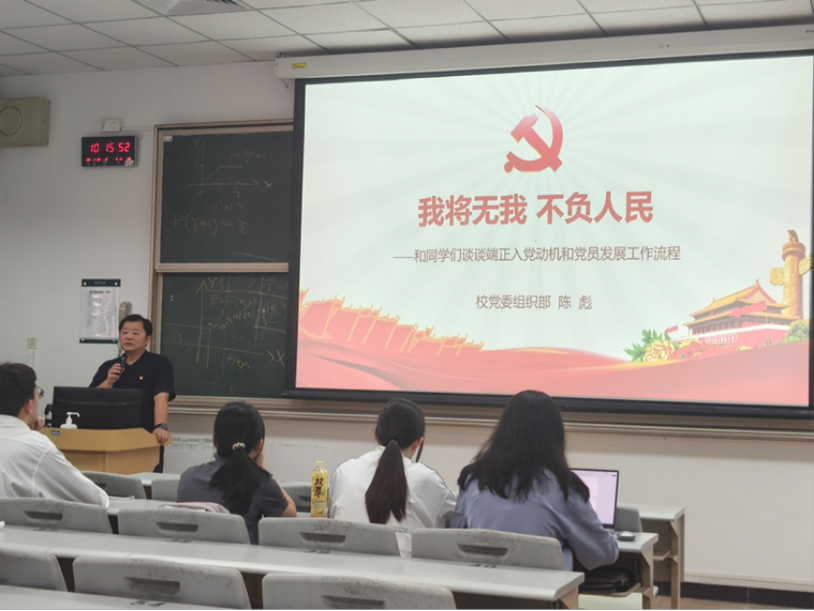 活动中,陈彪老师讲授 “我将无我,不负人民”主题党课。陈彪以马克思和毛主席的光荣事迹开篇,深入阐述了共产党员的精神内涵,强调了入党对于新时代青年的重要意义和和新时代共产党员的责任使命。陈彪鼓励同学们以实际行动践行党的宗旨,积极向党组织靠拢。随后,陈彪着重阐述了端正入党动机的深刻意义,强调要以“无我”的境界和担当,践行共产党人的初心和使命,引导同学们开展自我审视与反思,进一步坚定共产主义信仰,勇毅担当起民族复兴的时代重任。结合发展党员工作程序,陈彪详细介绍了党员发展的五个阶段工作,分享了指导学生申请入党的经验,并针对同学们在入党过程中和提交入党材料时可能出现的问题做出提醒和讲解。