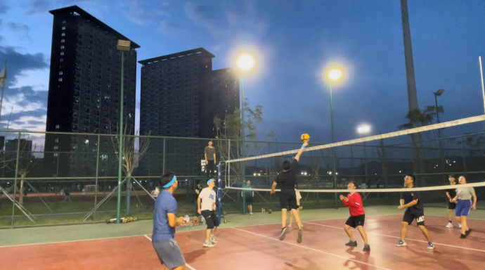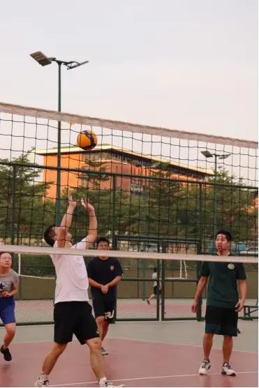第四局,双方球员均进入最佳状态,赛场上龙争虎斗,高潮迭起。尽管多数老师技术还不够娴熟,经过前三局的磨合,接传球已经展现出不错的默契。B队朱丹丹老师巾帼不让须眉,以连续四记完美发球将比分追平。双方队员在后续比赛中团结协作,配合得当,比赛场面进入白热化。