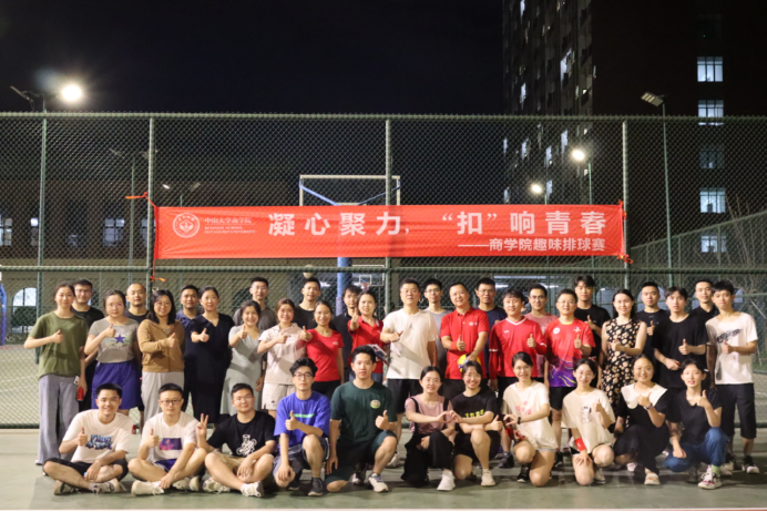 在党的二十大即将召开之际,为展现师生奋进新征程、建功新时代的精神面貌,商学院积极响应校工会“喜迎二十大,唱响新时代”群众活动号召,于2022年9月28日开展了一场师生同乐的趣味排球赛。比赛以“凝心聚力,‘扣’响青春”为主题,在学院领导带领下,全体教职工与22级研究生共同参与。