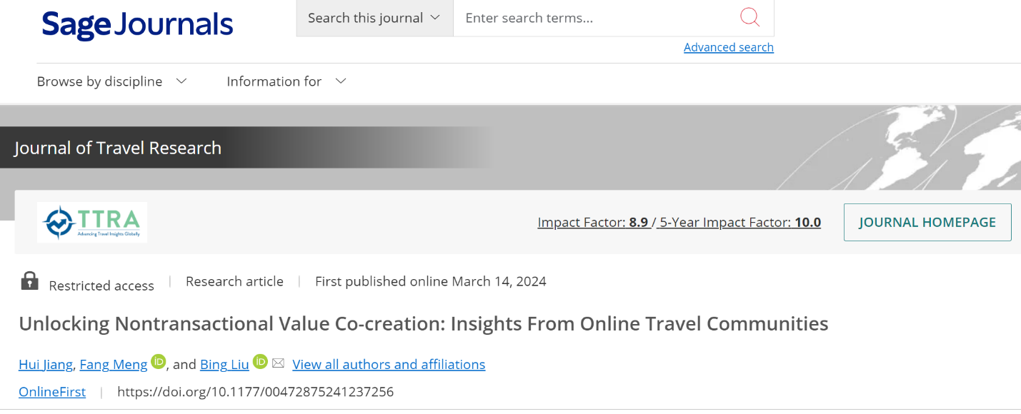 近日,商学院刘冰教授以通讯作者身份在Journal of Travel Research发表题为“Unlocking Nontransactional value Co-creation: Insights From Online Travel Communities”论文。论文合作者为南卡罗来纳大学的Fang Meng教授和博士研究生Hui Jiang。