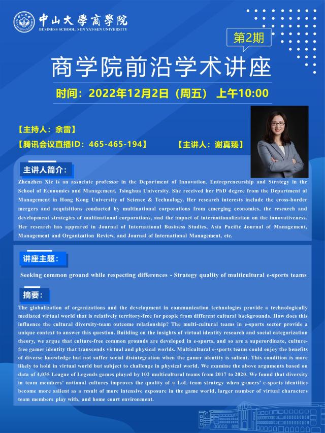 商学院前沿学术讲座第二期预告 | 主讲人:谢真臻副教授
