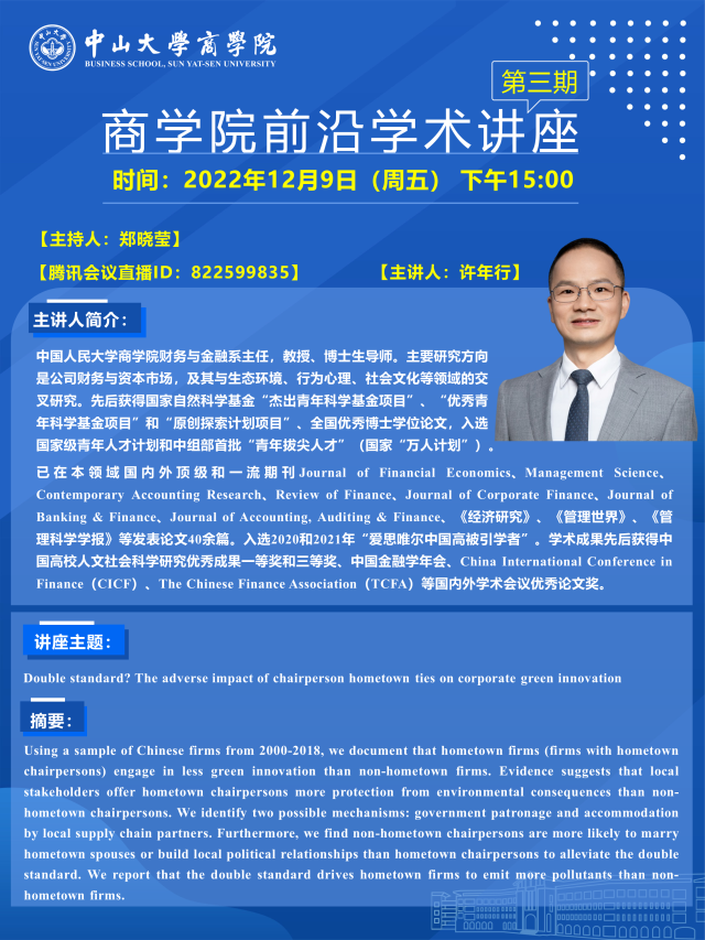 商学院前沿学术讲座第三期预告丨主讲人:许年行教授