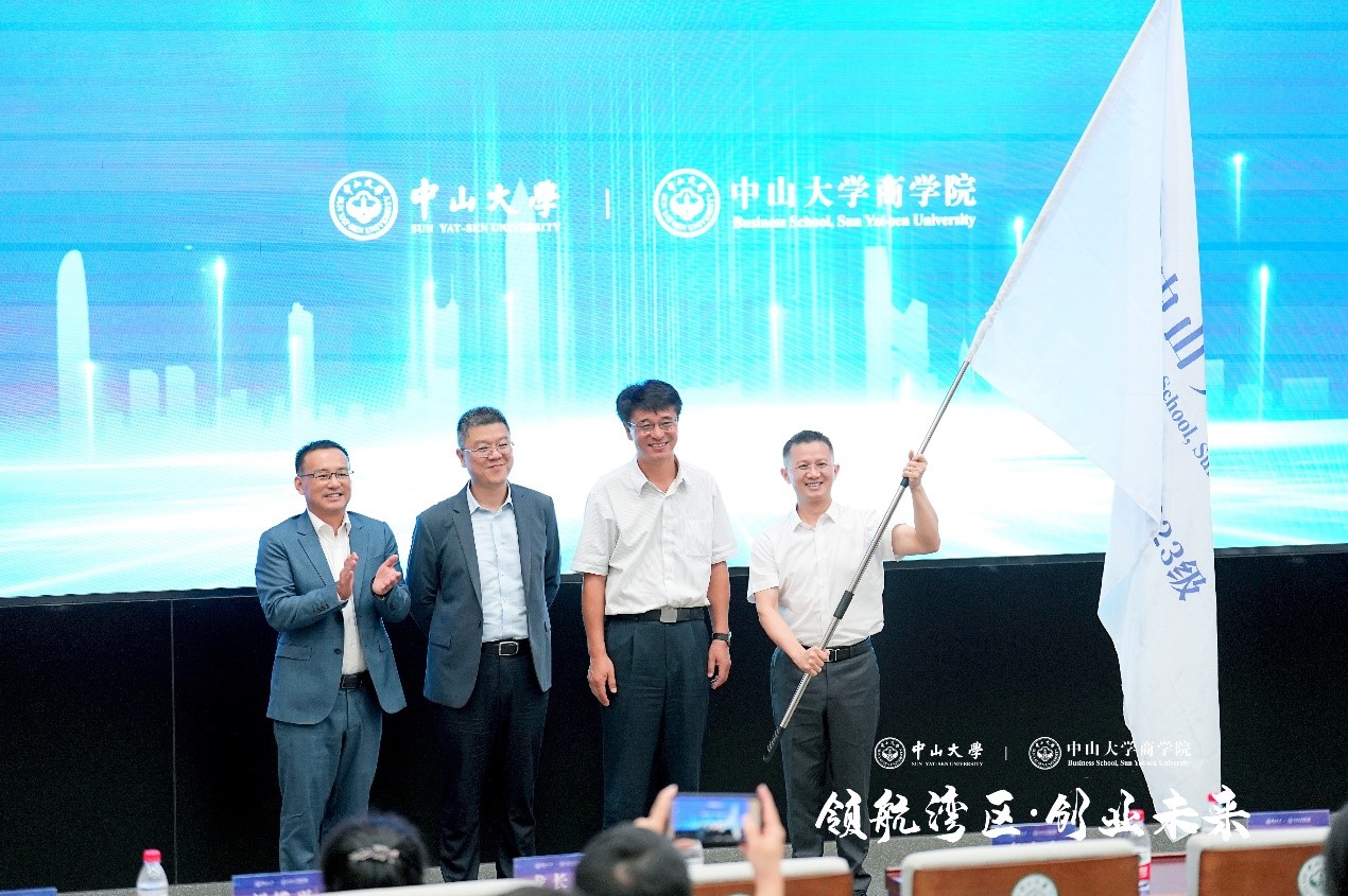 中山大学副校长邰忠智(右二)向MBA新生代表授旗