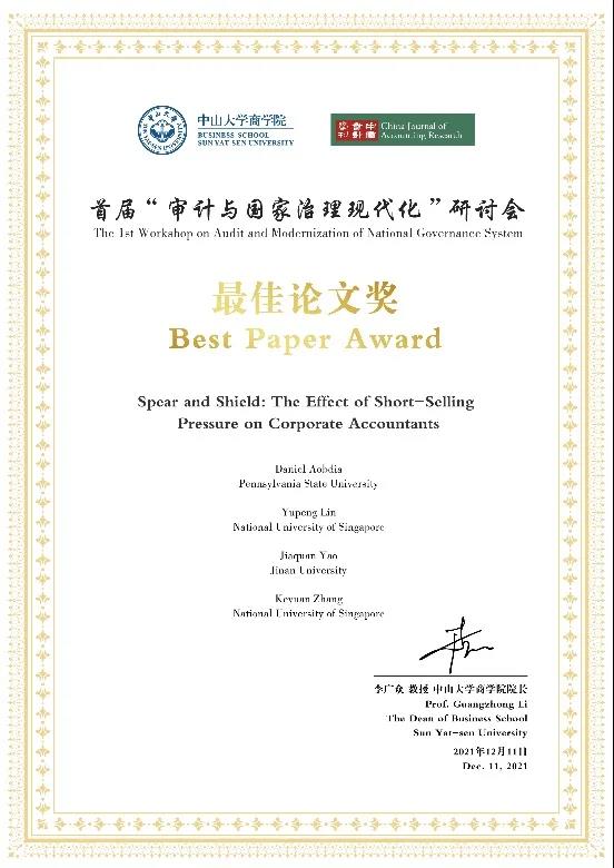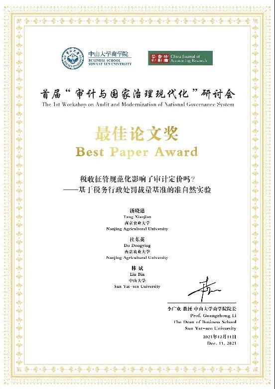本次会议经过多轮遴选,最终选取19篇论文参与汇报交流。其中,两篇论文获得最佳论文奖。会议尾声阶段,中山大学商学院院长李广众教授向最佳论文奖获得者颁奖。