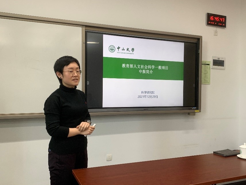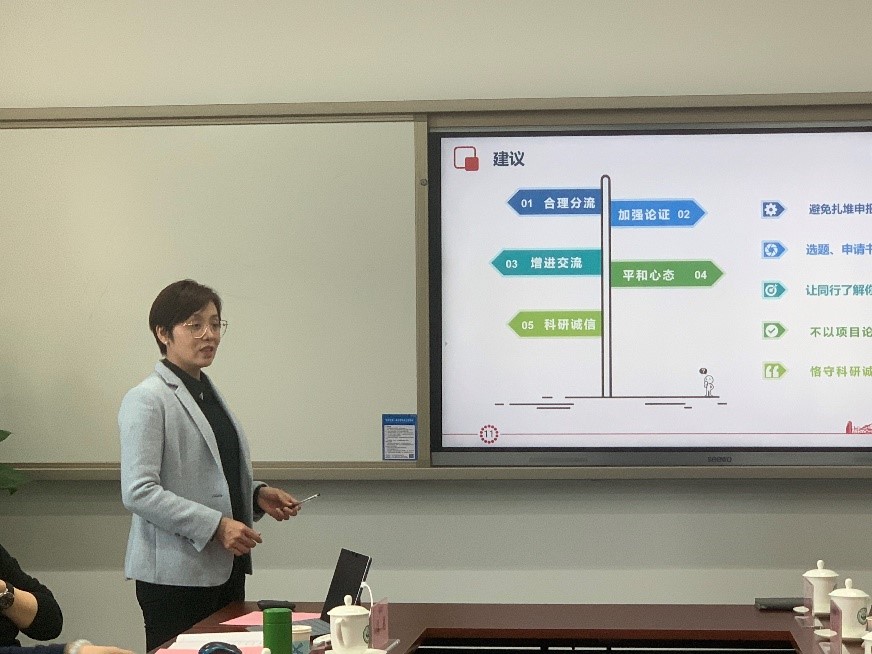 随后,文科处曾佳妮副处长(主持工作)介绍了座谈会背景和项目申报总体情况。她指出,本次座谈会开展的目的主要是分享国家社科基金、教育部人文社科项目的申报经验,听取各位老师对文科科研工作的意见建议,以便更好地开展文科科研工作。曾佳妮副处长(主持工作)介绍了近两年来我校科研项目立项的情况,分享了目前文科科研项目申报中存在的困难和问题。在课题申报建议方面,她分享了合理分流、加强论证、增进交流、平和心态、科研诚信等五个申报建议。