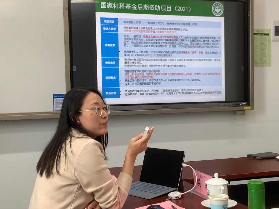 文科处姜帆老师介绍了国家社科基金项目申请政策,包括国家社科基金项目类别及各项目类别申报时间,并详细讲解了国家社科基金年度项目等三类项目的申报要求和侧重点、国家社科基金经费新政。姜帆老师结合相关案例分析讲解,向本院各青年教师介绍了申报的技巧,从项目申报选择、选题确定、如何精益求精、青年教师如何准备申报等实操层面上,给出了切实可行的建议。