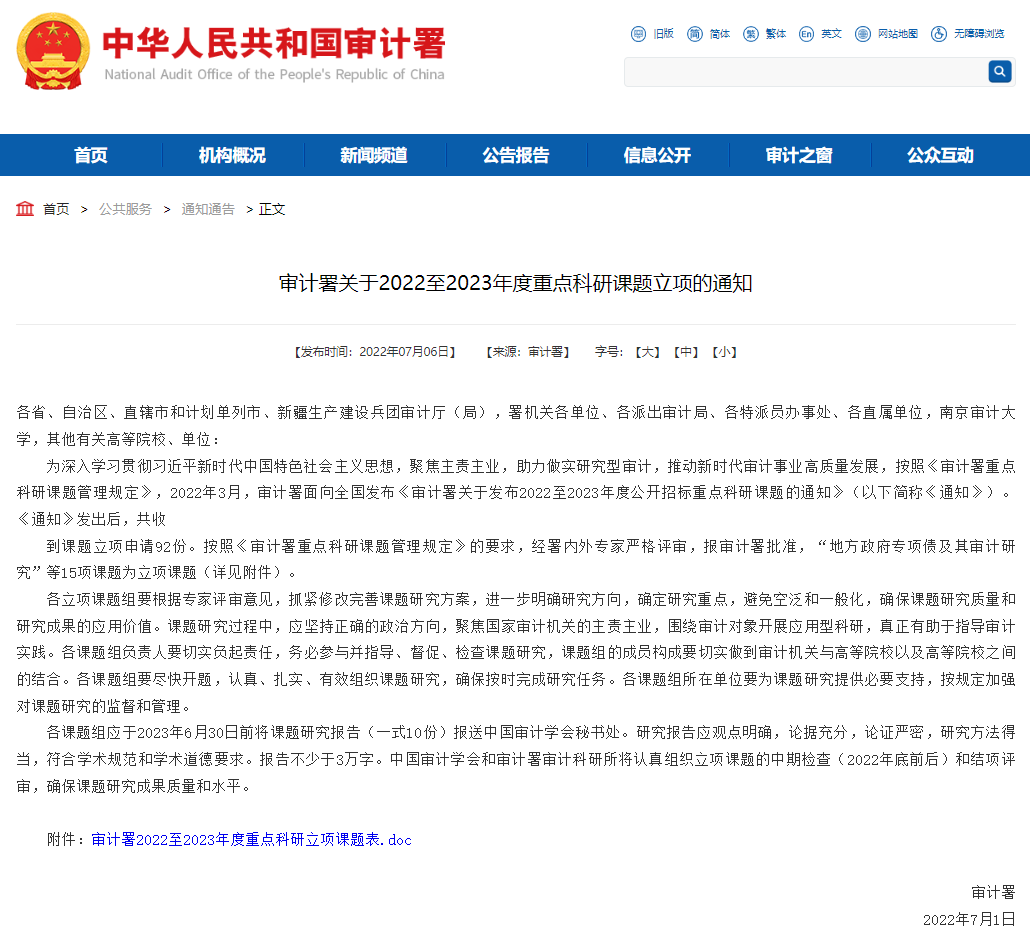 《审计署关于2022至2023年度重点科研课题立项的通知》