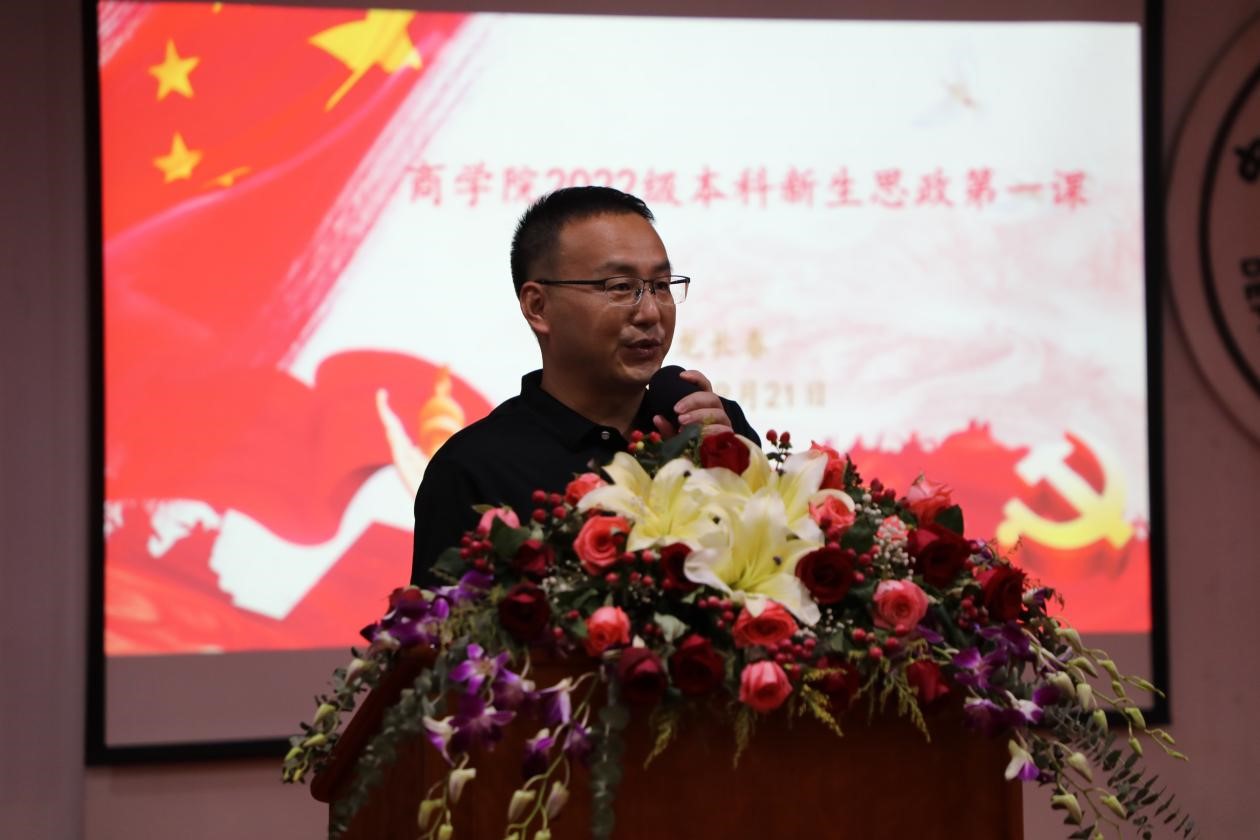 9月21日,商学院直属党支部龙长春书记以《回首百年初心,担当时代重任》为题,为2022级本科新生讲授了新学期“思政第一课”。
