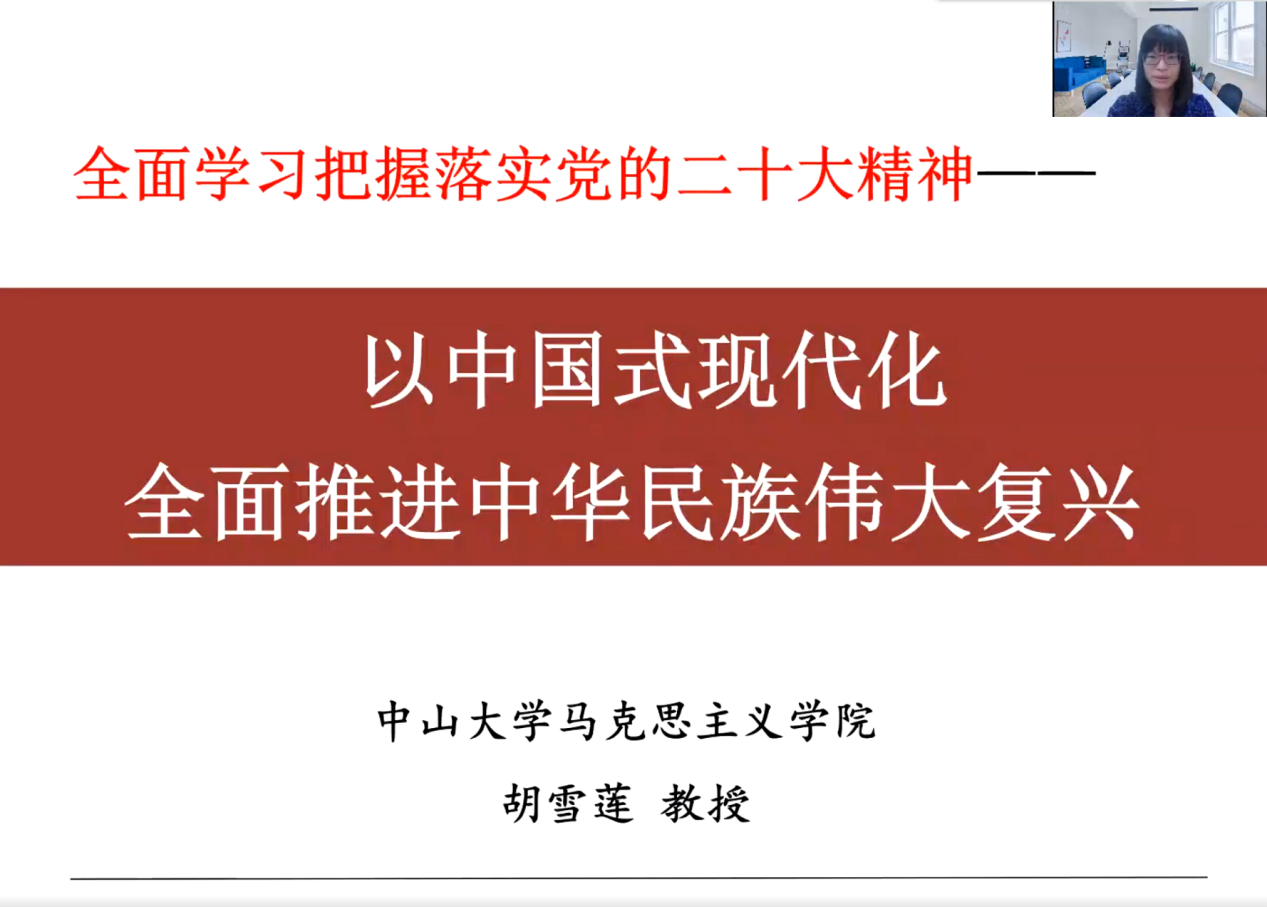 胡雪莲教授以《全面学习把握落实党的二十大精神——以中国式现代化全面推进中华民族伟大复兴》为题进行报告。习近平总书记在主持二十届中共中央政治局第一次集体学习时强调,全党要在全面学习、全面把握、全面落实上下功夫,坚定不移把党的二十大提出的目标任务落到实处,奋力夺取全面建设社会主义现代化国家新胜利。胡雪莲教授按照全面学习把握落实党的二十大精神的具体要求,梳理了二十大报告的总体结构,从总目标、实践成就与尚需解决的问题、理论成果与继续创新的原则、党的中心任务和各方面工作部署五个方面带领大家一起全面学习把握落实党的二十大报告。其中,胡雪莲教授重点讲解了中国式现代化与西方现代化的差异及其深刻内涵。中国式现代化,是中国共产党领导的社会主义现代化,既有各国现代化的共同特征,更有基于自己国情的中国特色,要以中国式现代化全面推进中华民族伟大复兴。报告最后,胡雪莲教授强调,党的二十大在政治、理论、实践上都取得了一系列重大成果,具有重大意义,要坚决维护习近平总书记党中央的核心、全党的核心地位,维护以习近平同志为核心的党中央权威和集中统一领导,深刻领悟“两个确立”的决定性意义,牢记“国之大者”,增强“四个意识”、坚定“四个自信”、做到“两个维护”,以昂扬的精神状态、务实的工作作风贯彻落实党的二十大精神,努力在新征程上开创党和国家事业发展新局面。