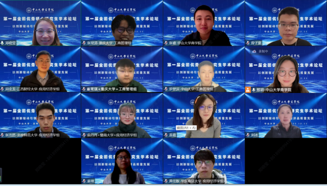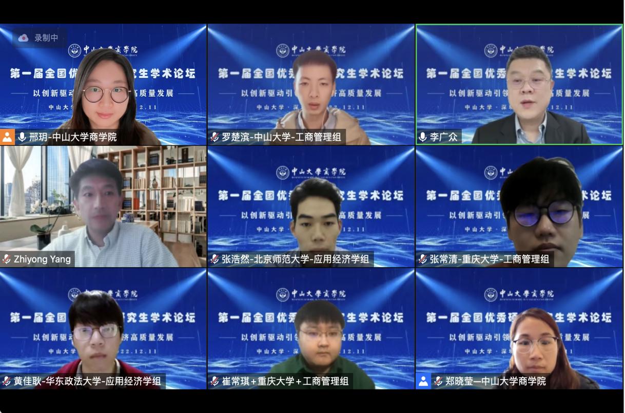 12 月11日,中山大学商学院第一届全国优秀硕士研究生学术论坛在线上顺利举行,论坛主题为“以创新驱动引领推动经济高质量发展”。本次论坛有幸邀请到了迈阿密大学杨志勇教授、北京师范大学戴觅教授、哈尔滨工业大学江源教授、中央财经大学宋顺林教授作为特邀专家进行主题讲座,并作为评审专家对学生的论文报告进行专业点评。论坛期间,各高校硕士生与各位专家学者展开深入讨论,共享学术盛宴。本论坛旨在为研究生提供一个展示科研成果、分享学术思想的平台,鼓励大家勇于创新、开拓进取,踊跃发表高水平学术研究论文,帮助相关学科研究生提升学术水平和综合素质,为莘莘学子的科研之旅导航。