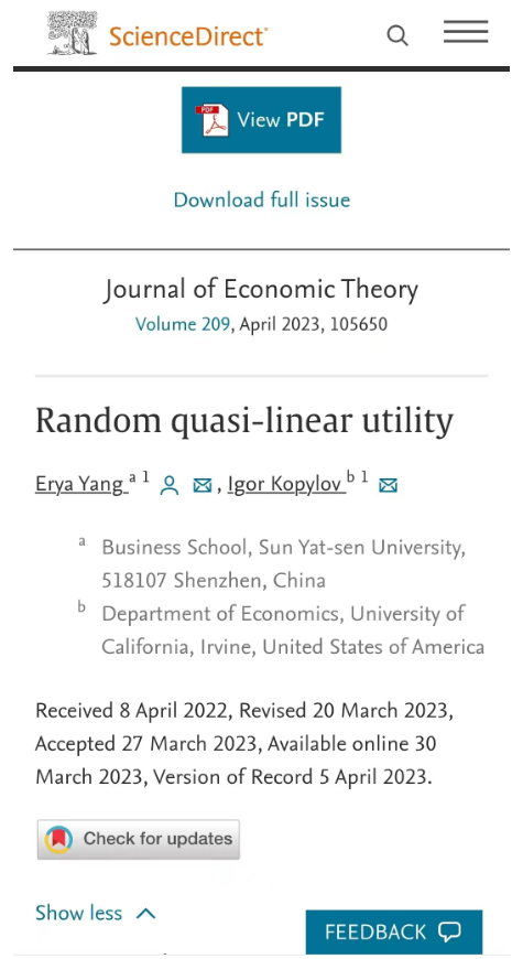 近日,商学院助理教授杨尔雅博士以第一作者、中山大学作为论文第一署名单位的研究成果“Random Quasi-linear Utility”(随机拟线性效用模型)在经济理论领域顶尖期刊Journal of Economic Theory上发表。