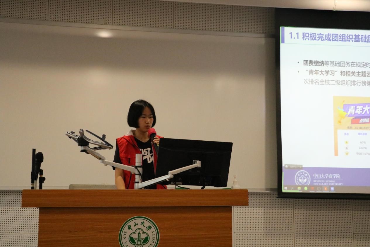 学生团委副书记邝钰霖同学作学院团委工作报告。她表示,在过去的一学期中,学院团委有序推进团组织建设与思想引领工作,稳步开展学术讲座、企业实践和志愿服务活动,协助学院推进科研育人与双创育人,多项活动在学生群体中取得良好反响。接下来,团委将创新理论学习、学术活动、志愿服务等工作形式,持续推动学院共青团工作高质量发展。