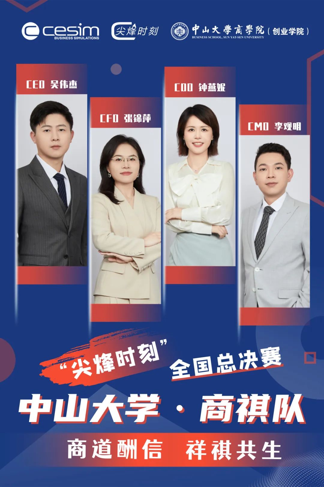 “商祺”队由中山大学商学院2023级MBA学生吴伟杰、张锦萍、钟燕妮、李观明组成。队伍秉持“商道酬信,祥祺共生”的理念,在指导老师周建铧的带领下,从初赛、复赛的激烈比拼中脱颖而出,成功晋级全国总决赛。