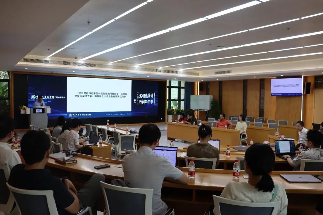 龙长春书记首先带领全体教职工进行思政学习,传达贯彻习近平总书记在全国科技大会、国家科学技术奖励大会、两院院士大会上的重要讲话精神,接着宣讲《中山大学 2024 年教师思想政治和师德师风建设工作要点》,并结合《师德警示教育学习手册》开展师德警示教育,对一系列师德违规行为的典型案例进行深刻剖析,详细解读《新时代高校教师职业行为十项准则》等高校教师职业行为规范和准则,并组织教研人员现场签署师德承诺书。龙长春强调,全体教职工要深刻认识教育的政治属性,不断加强思想政治和师德师风建设,努力践行教育家精神,严守理想信念,不逾底线,切实做到学高为师、身正为范。