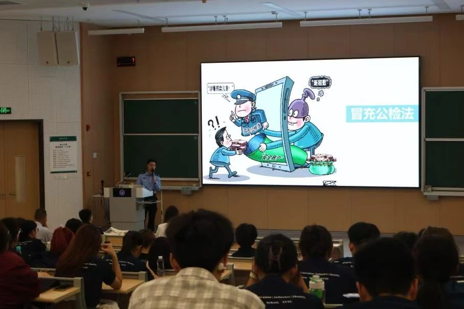 光明公安分局曾宇嘉警官为同学们进行校园安全教育。曾宇嘉强调任何人都会上当受骗,作为高校学生应树立防诈骗意识。他通过生动的案例讲解,向同学们揭示冒充公检法、“杀猪盘”、网络赌博等常见诈骗方式,并向同学们传授识别和防范诈骗的实用技巧。