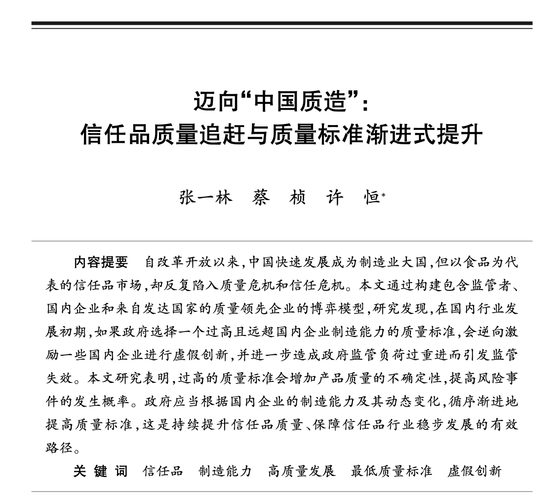 张一林、蔡桢、许恒:《迈向“中国质造”:信任品质量追赶与质量标准渐进式提升》,《世界经济》2024年第11期,第35-63页。