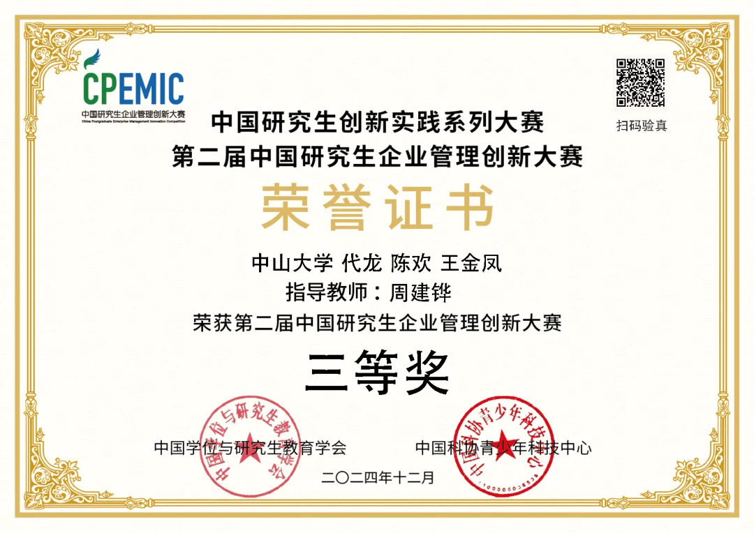 近日,第二届中国研究生企业管理创新大赛全国总决赛在成都举行,商学院MBA学生代表队在比赛中获得佳绩。其中,由周建铧老师指导的“C组”队获企业决策赛道三等奖,由薛付婧老师指导的“相山文曲星”队和“商学思行”队获商业分析与智能应用赛道三等奖;学院获优秀组织奖。