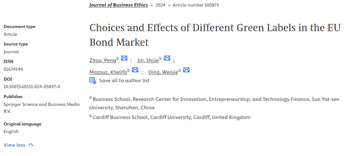 近日,商学院助理教授丁文捷作为通讯作者和共同一作的论文“Choices and effects of different green labels in the EU bond market”被Journal of Business Ethics接受发表。论文合作者为卡迪夫大学的Peng Zhou教授、在读博士生Shijie Jin、和 Khelifa Mazouz教授。