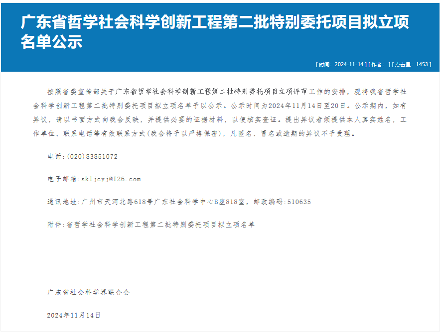 近日,广东省社会科学界联合会发布“广东省哲学社会科学创新工程第二批特别委托项目拟立项名单公示”。我院刘冰教授申报项目《农文旅融合驱动下的粤港澳大湾区城乡一体化发展策略研究》获批立项,类别为重大项目,资助金额50万元。项目批准号:GD24WTCXGC02。