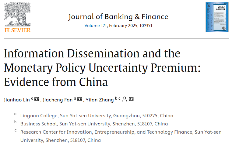 Lin, Jianhao, Jiacheng Fan, and Yifan Zhang (2024), "Information Dissemination and the Monetary Policy Uncertainty Premium: Evidence from China." Journal of Banking & Finance, 107371.