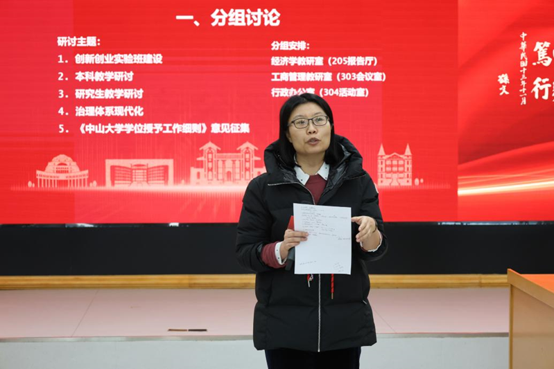 1月10日上午,全体教职工就创新创业实验班建设、本科与研究生教学质量提升、学院治理体系现代化等主题展开分组研讨。分组讨论结束后,经济学教研室主任姜坤、工商管理教研室主任刘冰、本科教学秘书黄王韬依次做分组汇报。