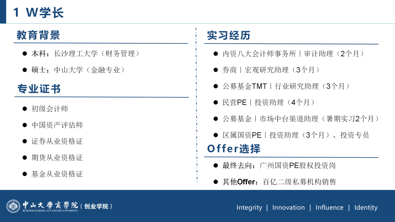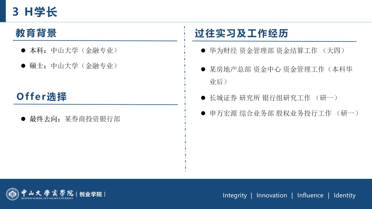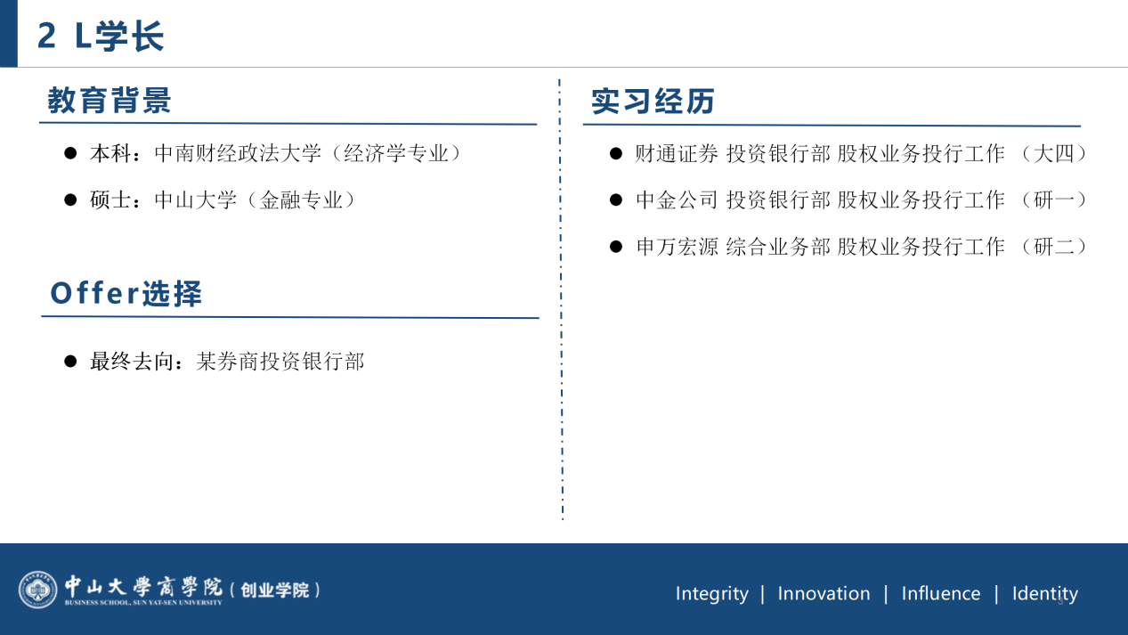 个人履历:本科和硕士均就读于中山大学金融专业。实习经历涉及华为财经资金结算、某房地产总部资金管理、长城证券研究所银行组研究、申万宏源综合业务部股权业务投行工作,最终选择某券商投资银行部。