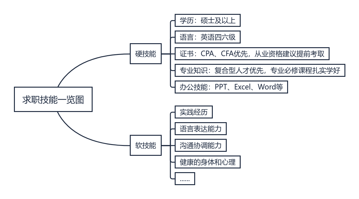 在求职过程中,就专业要求而言,应重点关注的硬技能包含学历 (硕士及以上)、语言(英语四六级)、证书(CPA、CFA优先,从业资格建议提前考取)、专业知识(复合型人才优先、专业必修课程扎实)、办公技能(PPTLEXCELIWORD等)。软技能包括实践经历、语言表达能力、沟通协调能力、健康的身体和心理、较好的适应能力、职业成熟度(实习及评价、情绪稳定、结果导向、行业经验等)。总体而言,商科类岗位对专业技能的要求强调综合素质的全面性,而股权投资岗位则更为侧重求职者的软技能水平与职业成熟度表现。