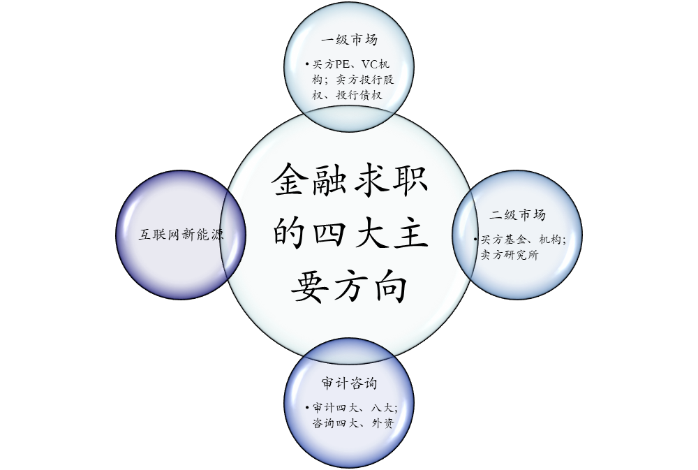 个人总结金融求职的四大主要方向:一级市场(买方PE、VC机构;卖方投行股权、投行债权)、二级市场(买方基金、机构;卖方研究所)、审计咨询(审计四大、八大;咨询四大、外资)、互联网新能源等。