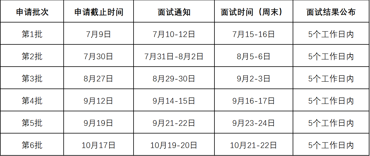 报名系统开放时间为2023年6月25日00时至2023年10月17日24时,提前面试将分6个批次依次举行,每批次的面试时间见下表:
