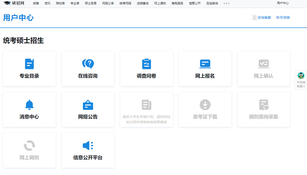 3、登录后请先仔细阅读《专业目录》及《网报公告》等信息,如有问题可使用“在线咨询”功能;阅读完成后请点击“网上报名”。