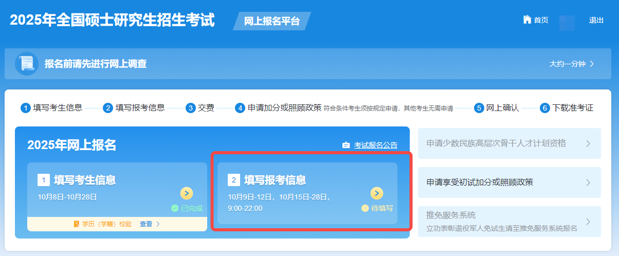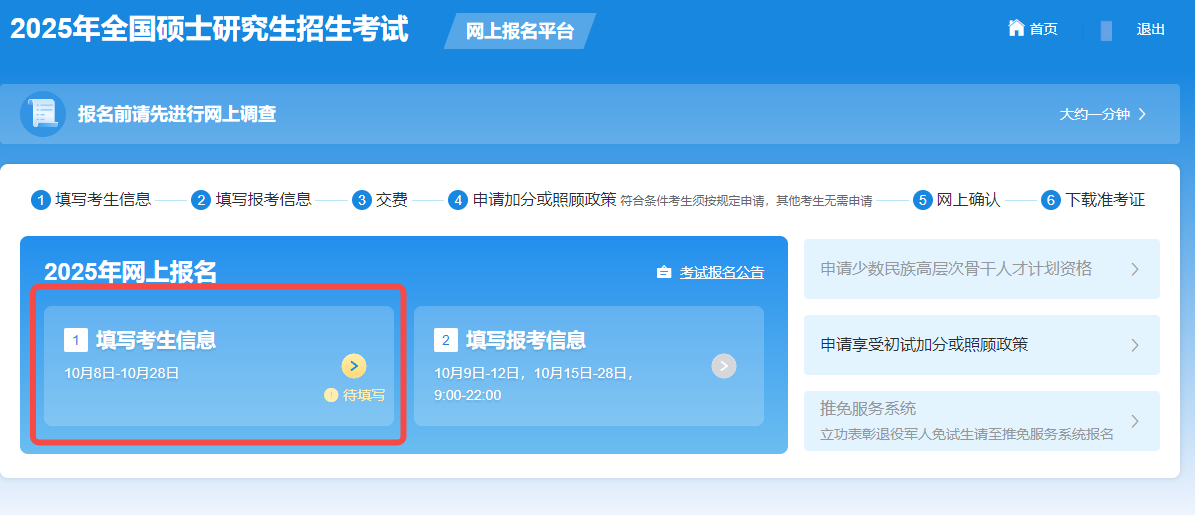 1、点击“填写考生信息”确认实名注册的个人信息准确无误后,点击“下一步”。