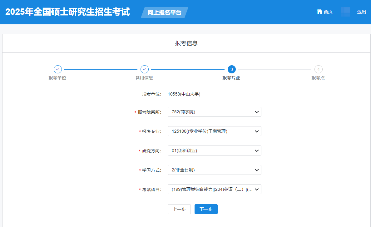 进入“报考信息”填写。考生报名时只能填报一个招生单位的一个专业。招生单位、考试方式、报考点等要慎重选择,一旦生成报名号后则不可以修改;如确实需要修改,须取消已有的报名,已取消的报名信息不可用于网上确认。
