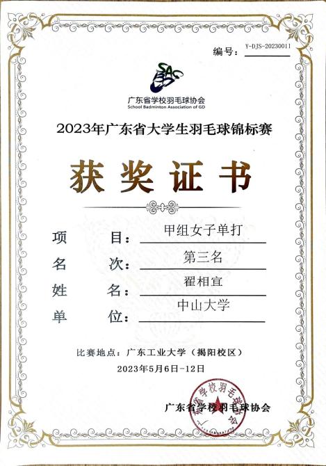 5月6日至5月9日,我院2022级本科生翟相宜随中山大学羽毛球队参加广东省大学生羽毛球锦标赛,荣获甲组女子单打第三名的好成绩。