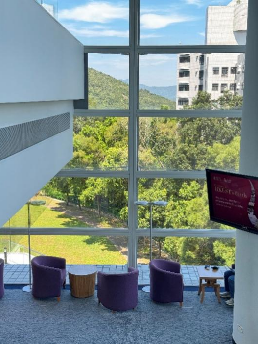 港科大有非常丰富的学习资源和良好的学习环境。咖啡厅的单人学习隔间,走廊上的开放讨论区,逸夫演艺厅外的学习桌,电梯间旁面对海平面的书桌等等,除了图书馆以外,几乎随处都能找到能坐下来学习的角落。在图书馆学到疲惫时,走出图书馆到开放的学习桌对着海或者草地换一个环境学习,马上又能进入高效学习的状态中。教学楼的走廊之间也常常有工科和机械专业的同学在展示和宣传自己制作的机器人,在同学们的热情邀请下体验新制作的机器人,也会感到是非常新奇的经历。